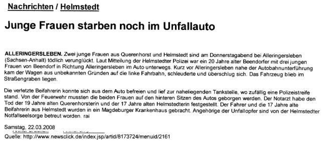 Ein kurzer Anruf zwischendurch, dann wurde es ruhig. Gegen 0:15 Uhr, kurz bevor wir schlafen gehen wollten, klingelte das Telefon. Jugend-liche am anderen Ende, völlig aufgelöst: „Habt ihr schon vom Unfall in Alleringersleben gehört? Sarah soll dabei gewesen sein.“